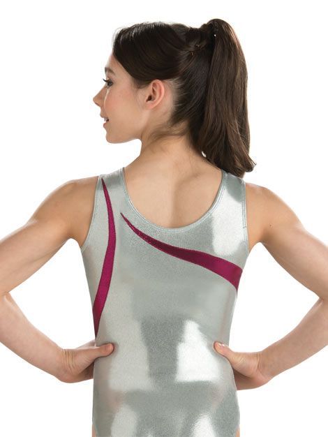• Classic scoop back, tank leotard in Sterling Silver Mystique features attractive cascading ribbon design in Sangria Mystique and Berry Sequinz.