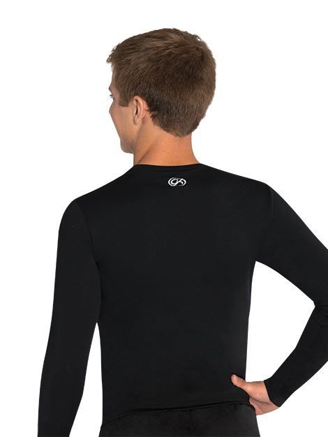 • Men's long sleeve crew neck cheer shirt in black drytech with white GK Cheer logo.