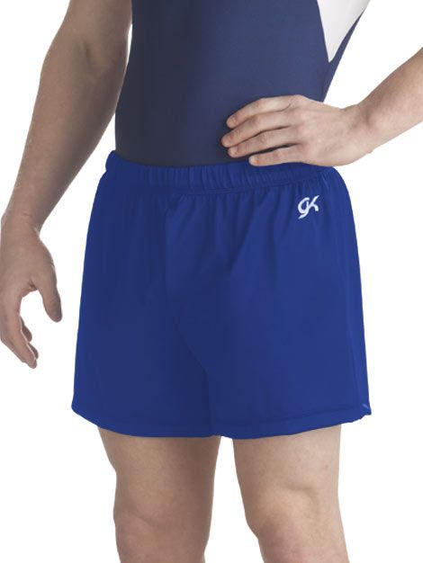• Men's gymnastics competition shorts in nylon/spandex with 5 inch inseam and elastic drawstring waist. These shorts are slightly longer in length with a mid-thigh hemline.
