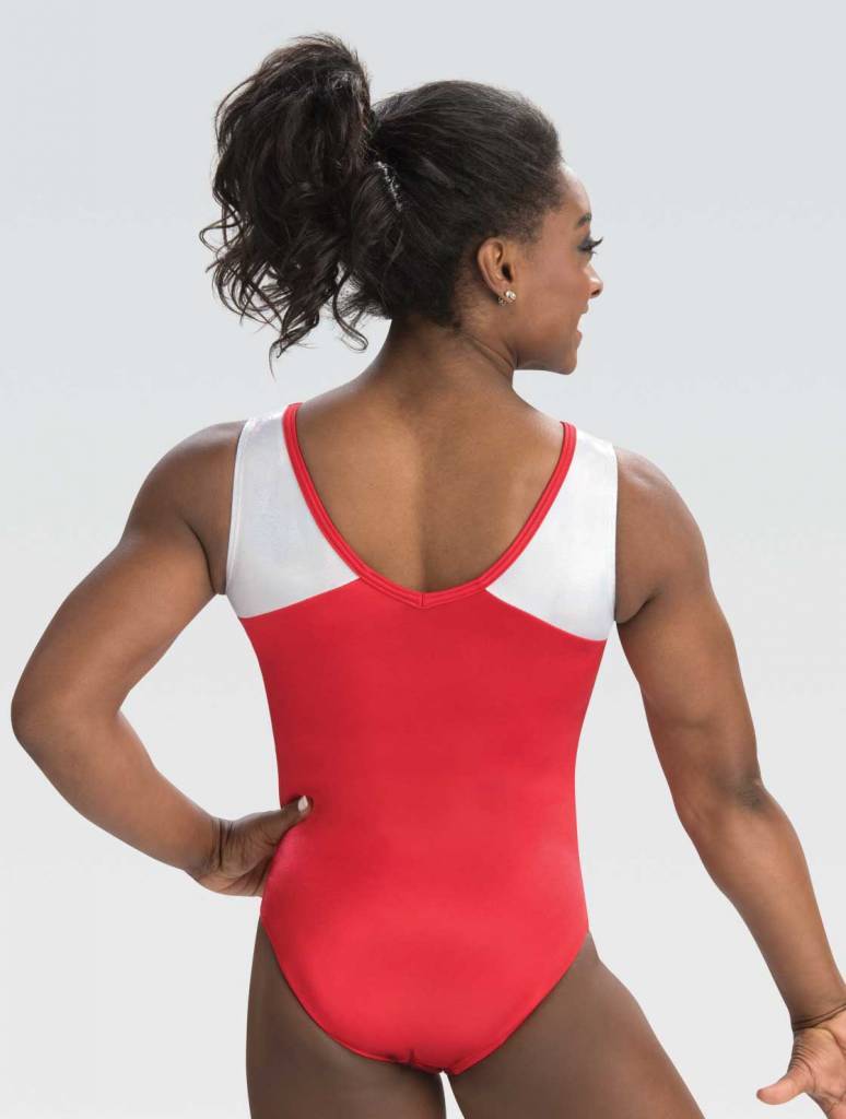 • V-neck tank leotard in Red Nylon/Spandex features White Opalescence Hologram Shoulders and dramatic overlapping Zig Zag Trim design across chest.
