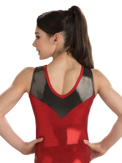 • V-neck and back gymnastics tank leotard in Red Mystique features Charcoal Mystique at shoulders and upper back and sophisticated Silver Sequinz pattern across front.