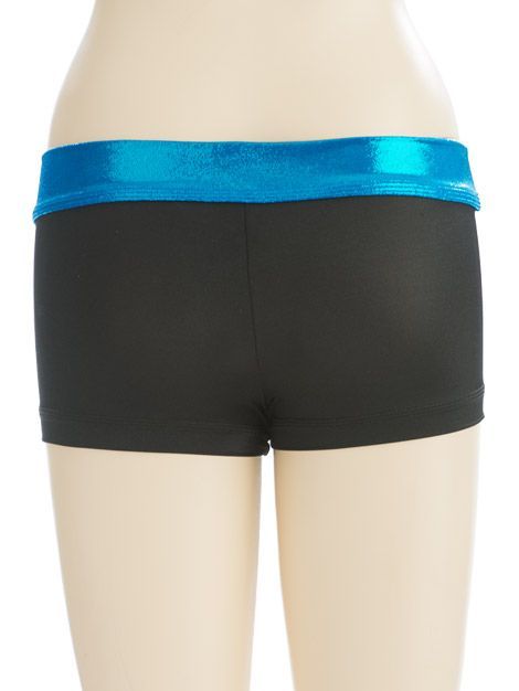 • Classic black nylon/spandex workout shorts with low rise comfort fit waistband in shimmering electric turquoise mystique.