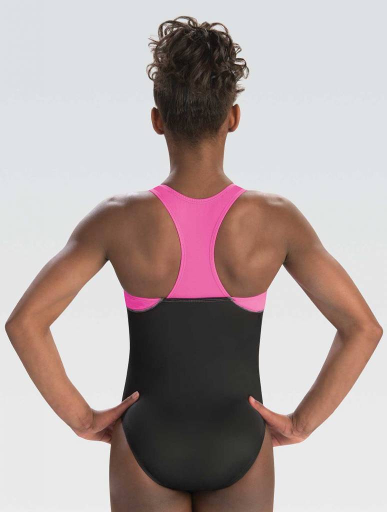 • Athletic racer back GymTek® gymnastics tank leotard features contrasting shoulder and back details in black campus stretchtek and berry techmesh.