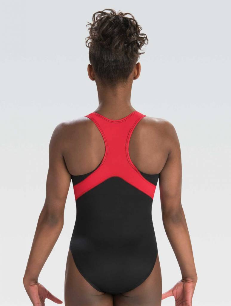 • Fierce racer back GymTek® tank leotard in black campus stretchtek features a red techmesh racerback styling.